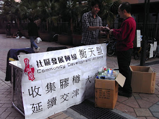 我們在09年11月22日聯同區內街坊組織「衝天盟」於天澤商場外設街站,向街坊搜集用完的膠樽,並將簽上姓名的Label貼於膠樽上,以示支持延續「交通費支援計劃」(交通津貼計劃),減輕低收入人士因跨區就業而承受高昂的交通費。